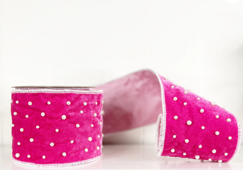 4"x 5 YDS Hot Pink Velvet and Pearls Wired Ribbon