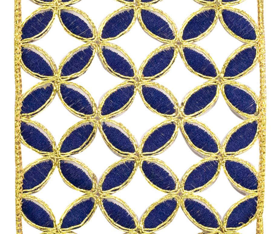 Indulge in luxury with our 4" x 5 YDS Petal Embroidery Cut Out Deluxe Wired Edge. Adorned in navy and gold, this exquisite trim adds a touch of elegance to any project. With its wired edge, it is perfect for creating stunning floral arrangements or adding a glamorous touch to your décor.