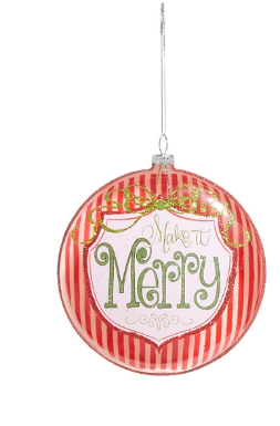 Add a festive touch to your holiday decor with the RAZ 5" Merry Shield Disc Ornament, available in three joyful styles: Merry, Joy, and Cheer. Crafted from elegant glass, this ornament shines beautifully on any tree. Measuring 5 inches in diameter, it features exclusive artwork by Nicole Tamarin, making it a unique and charming addition to your seasonal collection. Celebrate the season with this timeless piece that brings warmth and happiness to your home.