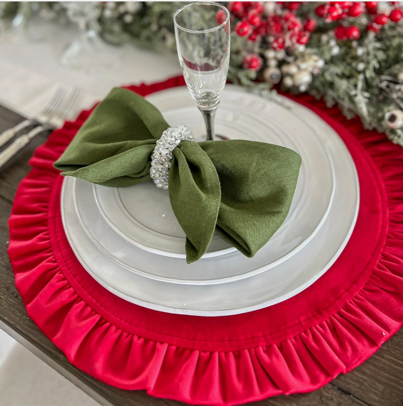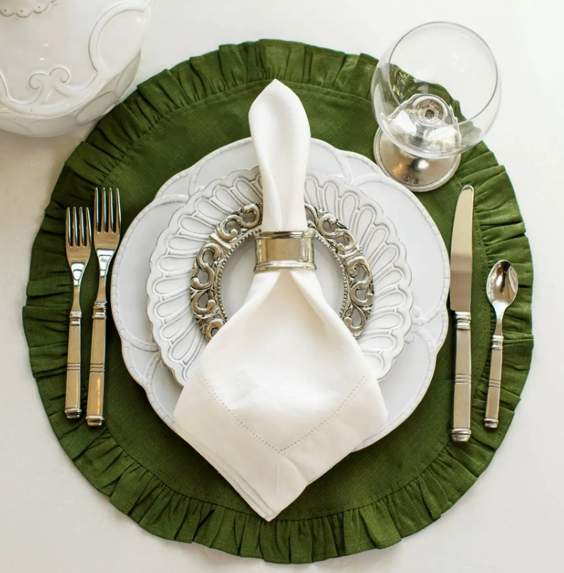 18" Round Ruffle Linen Placemats in Evergreen