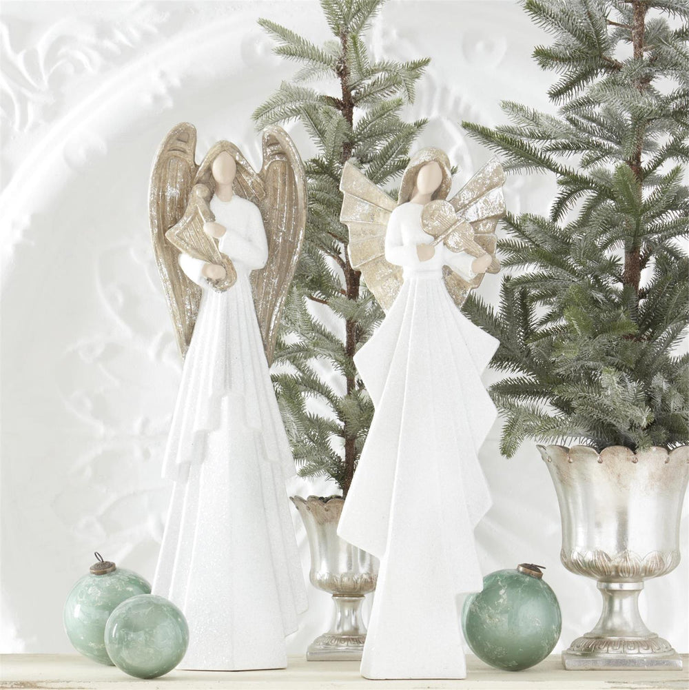Indulge in a touch of elegance with our white-glittered angels playing instruments constructed of polyresin. Available in two sizes, 26.25" or 24.25", these ethereal beings add a charming touch to any space. The glittered details create a shimmering effect, evoking a sense of celestial beauty to your decor.