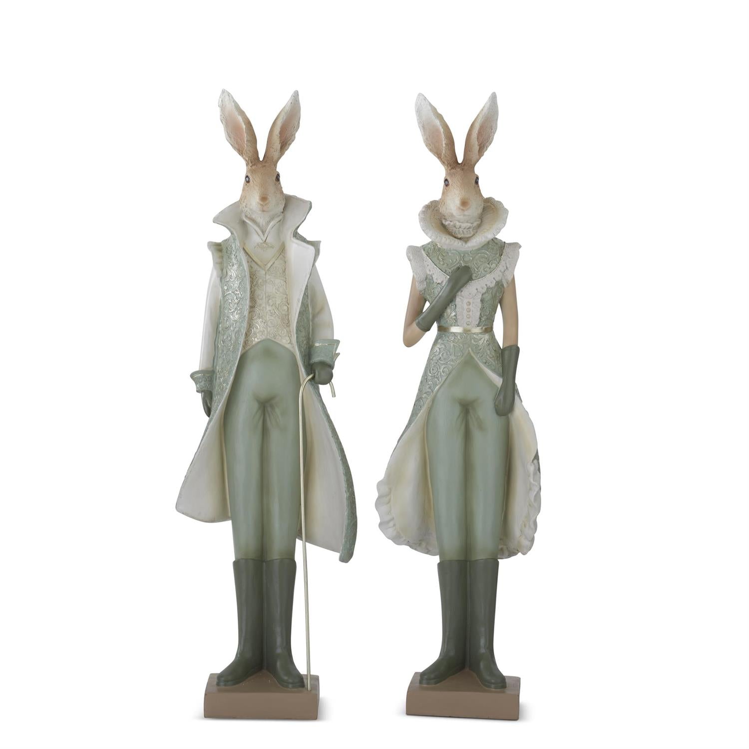 Bring springtime charm to your home with this delightful set of two Easter bunnies. Standing 23 inches tall, these adorable polyresin figures feature a soft sage green and cream color palette that complements any décor style. Perfect for seasonal displays, mantels, or garden arrangements, this duo adds a whimsical touch to your Easter celebrations. Each bunny is carefully crafted with attention to detail, making them ideal for collectors and holiday enthusiasts alike.